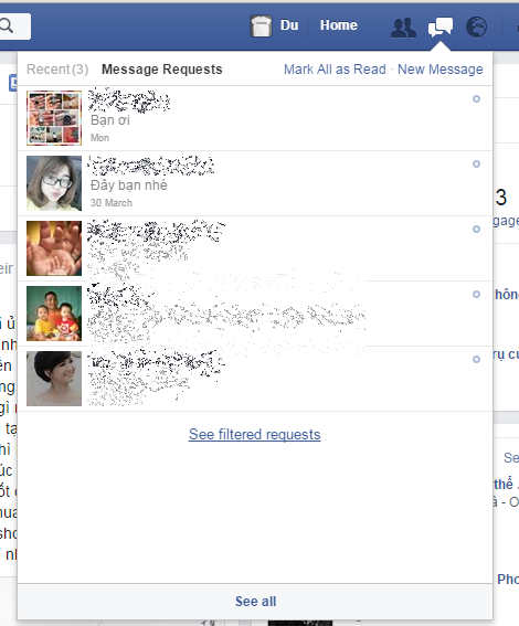 Bước 1: Truy cập Facebook trên máy tính, chọn biểu tượng tin nhắn, chọn tab Tin nhắn đang chờ (Message Requests) bên cạnh tab Gần đây (Recent). Nhấn vào Xem tin nhắn đã lọc (See filtered requests) ở dưới cùng.