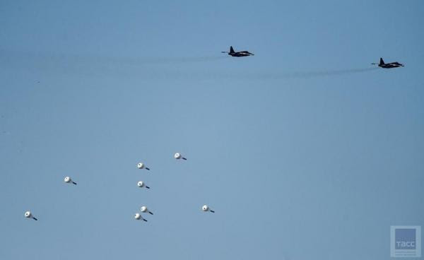 Trong ảnh, biên đội cường kích Su-25 ném bom chùm KMGU – mỗi quả bom đều được gắn dù hãm thả ở độ cao thấp. Nguồn ảnh: TASS