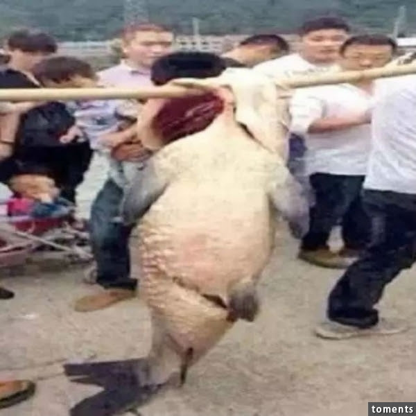 Trong buổi sáng cùng ngày, sau khi nước lũ tràn đập, con cá khổng lồ đã bị giết thịt để ăn.