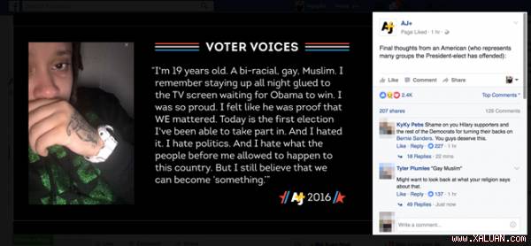 "Tôi 19 tuổi, là con lai và theo đạo Hồi. Tôi từng thức cả đêm, dán mắt vào màn hình TV để mong chờ Obama thắng cử. Tôi đã rất tự hào", "Hôm nay là lần đầu tiên tôi được tham gia bầu cử. Và tôi đã ghét nó. Tôi ghét chính trị.