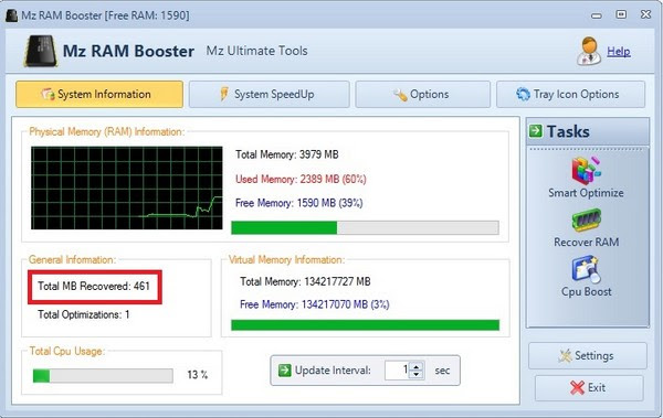 Mz RAM Booster là phần mềm miễn phí cho phép cải thiện hiệu suất của máy tính bằng cách tối ưu bộ nhớ RAM cũng như CPU trên máy tính, từ đó giải phóng được nhiều tài nguyên hệ thống hơn giúp các phần mềm hoạt động mượt mà và nhẹ nhàng hơn.