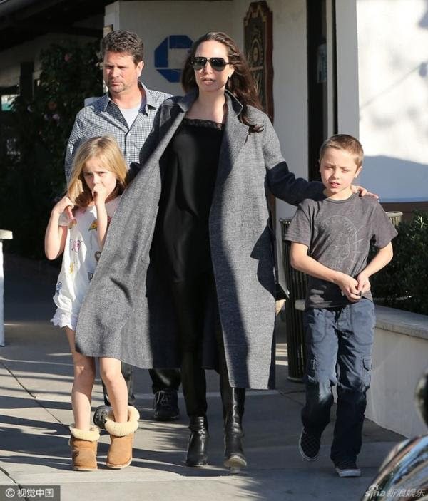 Hôm 28/1 (theo giờ địa phương), Angelina Jolie xuất hiện trên đường phố Malibu cùng hai nhóc sinh đôi - Knox và Vivienne. Nữ diễn viên 41 tuổi thon thả với quần bó sát, boots cao cổ và áo khoác dài quá đầu gối. Hình ảnh Angelaina Jolie hiện tại khiến nhiều người nhớ lại thời kỳ hoàng kim về sắc đẹp của cô.
