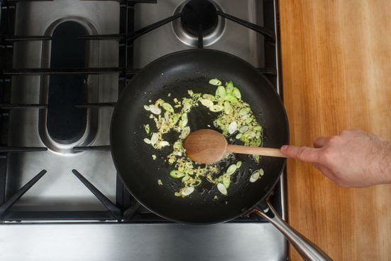 Cho 10ml dầu oliu vào chảo đun nóng, thêm gừng và gốc hành vào xào, nêm muối và hạt tiêu rồi đảo cho tới khi thơm.