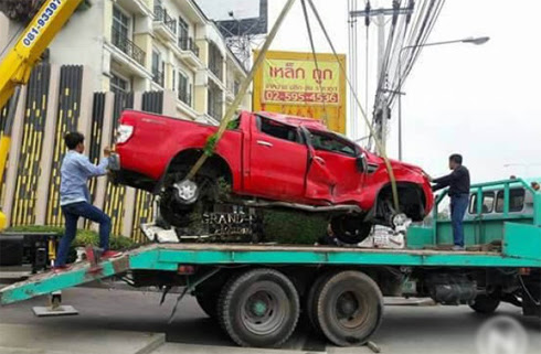 Tai nạn xảy ra dịp cuối tuần trước ở lối vào một khu khách sạn villa ở Nonthaburi khiến 2 người bị thương. Một số nhân chứng cho biết, chiếc bán tải hiệu Ford đang chạy khá nhanh bỗng phanh gấp và lao vọt lên bức tường gắn tên khu villa có tên Grand Bangkok Boulevard rồi nằm yên tại chỗ.