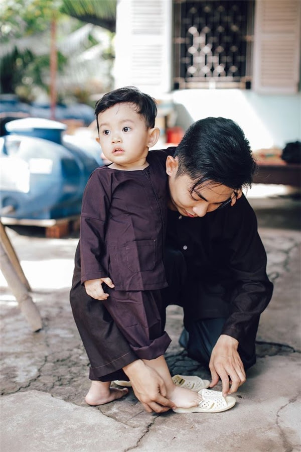 Cậu bé trông vô cùng đáng yêu với trang phục màu nâu thẫm, đồng điệu với ông bố trẻ.