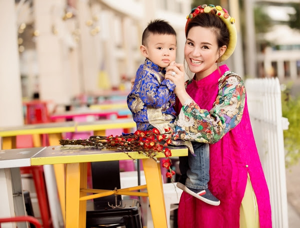 Dù bận rộn với lịch diễn cuối năm nhưng Nhật Kim Anh vẫn dành thời gian để xuống phố du xuân cùng con trai. Cậu bé nổi bật trên đường phố với bộ áo dài màu đỏ, họa tiết sắc vàng tươi tắn do đích thân mẹ lựa chọn.