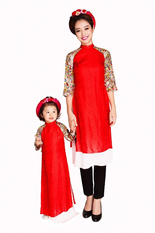 Năm trước, Elly Trần và con gái cũng từng khiến khán giả thích thú khi diện áo dài gấm với sắc đỏ rực xuất hiện trong khung cảnh Tết đậm chất miền Nam.
