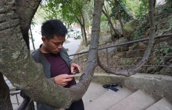 Du khách thường tranh thủ ngồi lên "võng tiên" khiến thân cây Gắm nhiều chỗ nhẵn bóng.