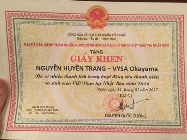 Huyền Trang vui mừng nhận được bằng khen của Đại sứ quán Việt Nam tại Nhật Bản