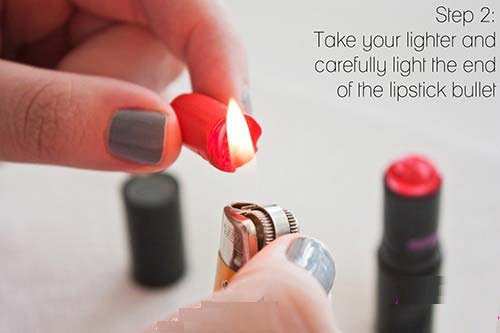 Bạn chuẩn bị 1 chiếc bật lửa, hơ mẩu son bị gãy trước ngọn lửa một cách nhẹ nhàng và cẩn thận trong khoảng 15 giây rồi lắp lại mẩu son gãy vào thân son rồi vặn son xuống và đóng nắp lại. Đặt cây son vào tủ lạnh trong khoảng 10 - 15 phút để thỏi son dính liền lại, thế là bạn đã có thỏi son ngon lành rồi.
