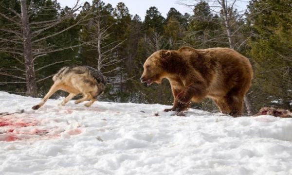 Một con sói bỏ chạy thoát thân để tránh bị gấu xám tát trúng.
