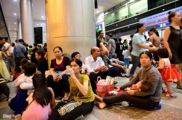 Nhiều gia đình mang theo đồ ăn, thức uống, trải ra nền nhà ga từ sớm. Chị Phan Thanh Tú (ngụ quận 6) cho biết sợ chuyến bay bị trễ đến giữa đêm nên cả nhà chuẩn bị ít đồ ăn, phòng khi đói bụng.