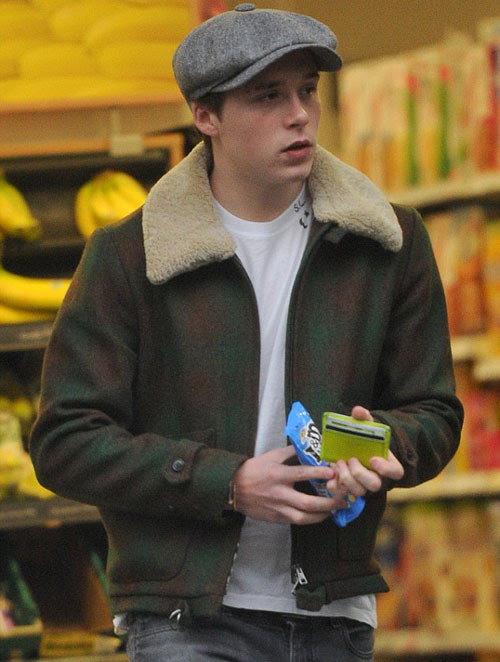 Hot boy 17 tuổi cùng bạn bè xuống phố đi dạo và mua đồ hôm 12/1 tại North London. Cậu cả nhà Becks gây chú ý với chiếc mũ baker được cho là 'mượn' của bố.
