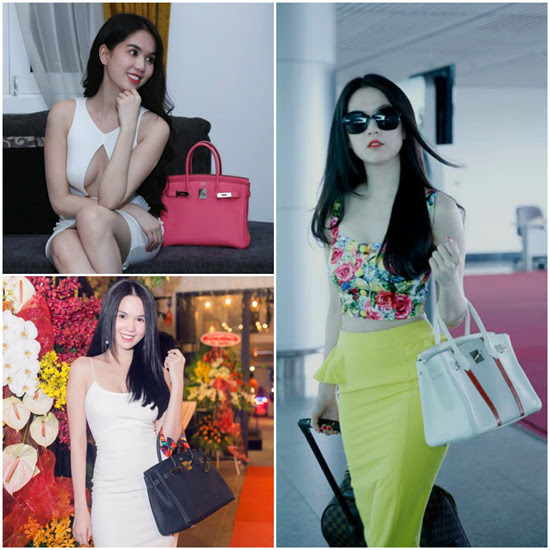 Người đẹp tự tin tuyên bố mình sở hữu nhiều túi Hermes nhất showbiz Việt với 12 chiếc, mỗi chiếc trị giá khoảng 11.000 – 12.000 USD (khoảng 250 triệu – 272 triệu VND). Con số 12 chiếc đã lâu chưa được Ngọc Trinh cập nhật với báo chí.