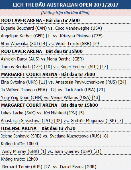 Tâm điểm trong loạt trận cuối ngày sẽ là cuộc chiến giữa hạt giống số 17 Roger Federer và hạt giống số 10 Tomas Berdych. Federer trong hai vòng đầu tiên chơi rất tốt, anh đều có những chiến thắng nhanh, Berdych cũng vậy. Nếu Federer giàu kinh nghiệm thi đấu bậc nhất trong làng banh nỉ nam hiện nay thì Berdych cũng thuộc tốp đầu thế giới, tay vợt người CH Séc từng hai lần lọt tới bán kết Úc mở rộng, anh cũng từng vươn tới vị trí thứ 4 trên bảng xếp hạng của ATP.