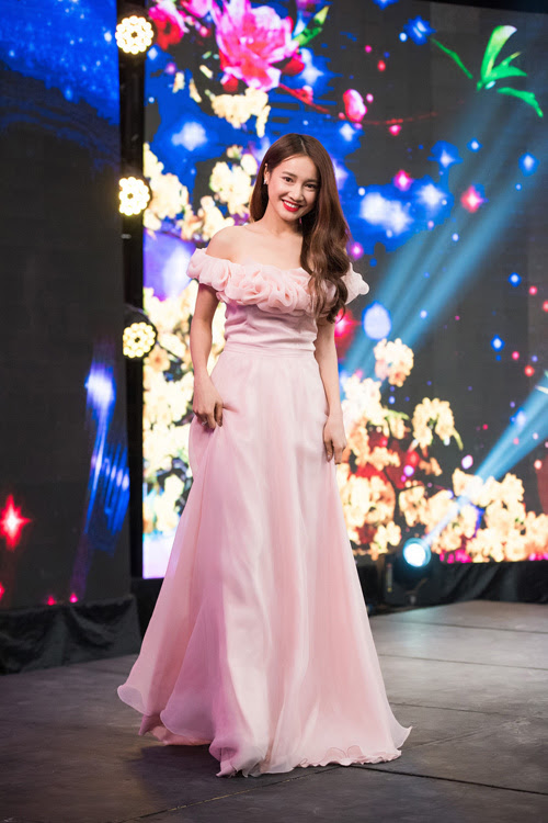 Hari Won ghi điểm với váy voan xanh ngọc đính đá. Cô làm tóc và trang điểm hài hòa trang phục.