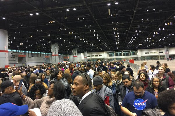 Hàng nghìn người thậm chí xếp hàng từ lúc 2h chiều, và các quan chức ở McCormick Place đang phải đưa họ tới một khu chờ khác vì hàng người đã quá dài.