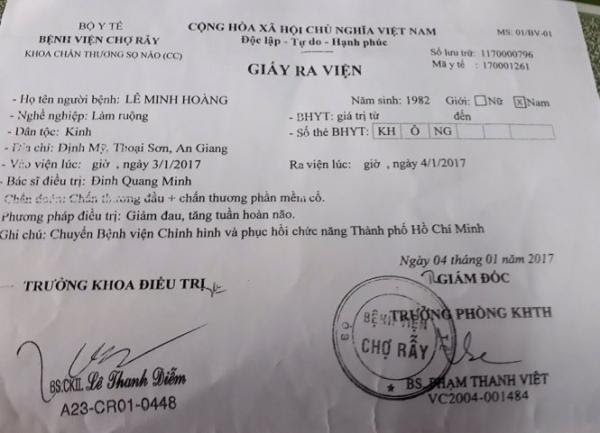 Hiện anh Hoàng mới chuyển qua khoa Chấn thương chỉnh hình sau khi Bệnh viện Chợ Rẫy chẩn đoán bị “chấn thương đầu và chấn thương phần mềm cổ”. Còn anh Trung đang nằm ở Bệnh viện An Giang.