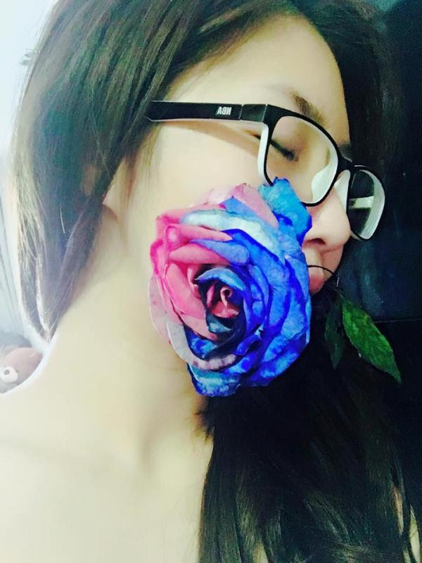 Cách khoe bông hoa nhuộm màu sắc lung linh được tặng đúng dịp Valentine của Hương Tràm đầy quyến rũ khi cô ngậm khéo cành hoa trên miệng.