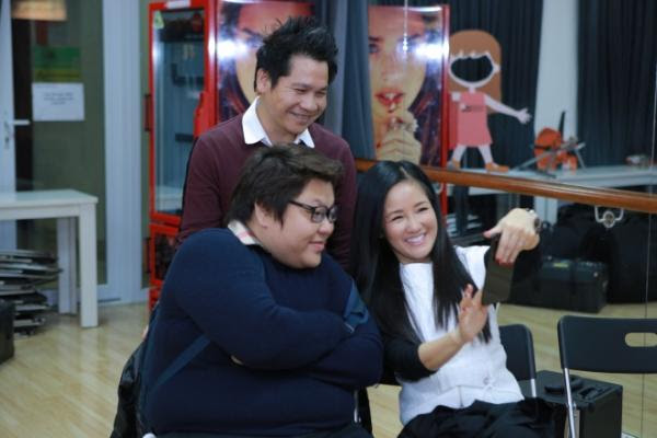 Trọng Tấn và Hồng Nhung chụp ảnh kỷ niệm trong buổi tập.