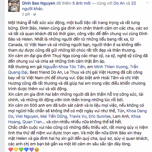 Mới đây, ca sĩ Đình Bảo của nhóm AC&M đã chia sẻ trên trang cá nhân và gửi lời cảm ơn tới tất cả bạn bè cùng các khách mời đã tới chung vui trong đám cưới của anh và bạn gái Helen Nguyễn.