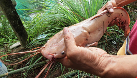 Theo lời anh Tín, trước đây anh thả nuôi cá trê và xuất bán khoảng 6 tấn cá thương phẩm cho lái và khi thu hoạch cá phát hiện có 20 con có màu hồng phấn trông rất lạ nên giữ lại nuôi và hiện số cá này trọng lượng mỗi trên 500g, có con trên 1kg và thậm chí 3kg.