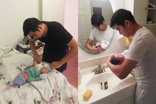 Vốn rất kỹ tính, Thanh Bình tự tay chăm sóc con. Trong ảnh, nam diễn viên cẩn thận thay tã, tắm rửa cho con trai. (Ảnh: FBNV)