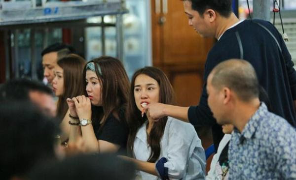 Đi ăn khuya với ekip, Trường Giang cũng phải cẩn thận ngó sang xem Nhã Phương có ăn được nhiều không.
