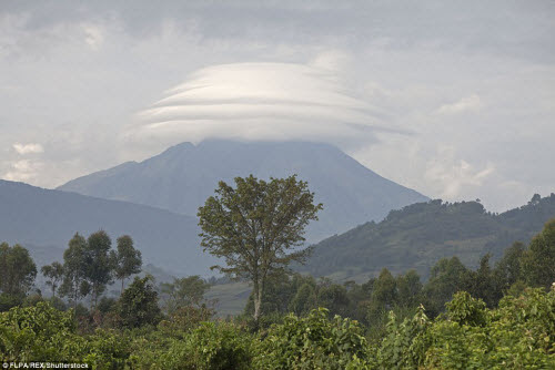 Đám mây hình thấu kính trông như chiếc mũ của núi lửa ở vùng núi Virunga, Uganda.