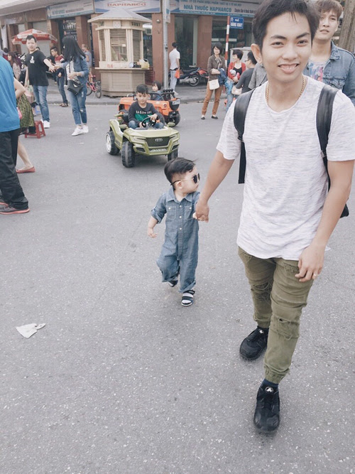 Phan Hiển tỏ ra là ông bố đảm đang khi bế và địu con trai trên vai trong suốt buổi dạo phố. Anh để bà xã thảnh thơi ngắm phố phường.