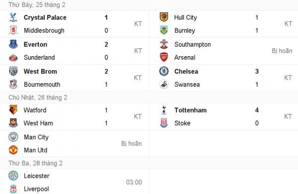Kết quả và lịch thi đấu vòng 26 Premier League.