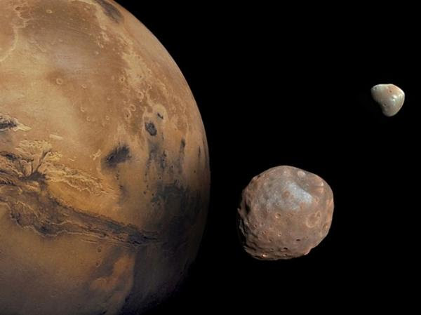 Nhà khoa học chỉ rõ, sao Hỏa đang tác động lực hấp dẫn, từ trường cực đoan một cách tích cực lên hai Mặt trăng vệ tinh Phobos và Deimos. Nguồn ảnh: Dailymail.