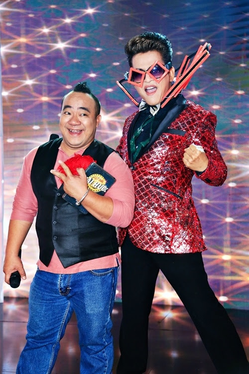 Trong tập ba game show "Cặp đôi hài hước" sắp phát sóng, Thanh Bạch (phải) làm giám khảo. Anh xuất hiện trên sân khấu với bộ vest màu đỏ ruby lấp lánh bên giám khảo - diễn viên Việt Trinh.