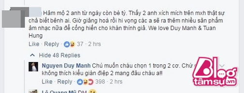 Thời gian vừa qua, lùm xùm của Duy Mạnh mâu thuẫn với Tuấn Hưng đã chiếm được sự quan tâm đặc biệt của độc giả. Được biết, nguyên nhân là do Duy Mạnh đã cho nhạc Tuấn Hưng, nhưng thứ mà anh nhận lại là những lời chửi bới thay vì biết ơn. Sau khi cả 2 bóng gió trên Facebook và trả lời phỏng vấn, Tuấn Hưng đã quyết định gọi điện cho đàn anh để giải quyết mọi chuyện. Trên Facebook, tối 23/2 Tuấn Hưng chia sẻ rằng đã giải quyết xong mọi chuyện, dường như mâu thuẫn đã được giải quyết ổn thoả bằng cách nói chuyện trực tiếp với nhau. Tuy nhiên, nam ca sĩ “Kiếp đỏ đen” vẫn không có bất kỳ động thái nào.