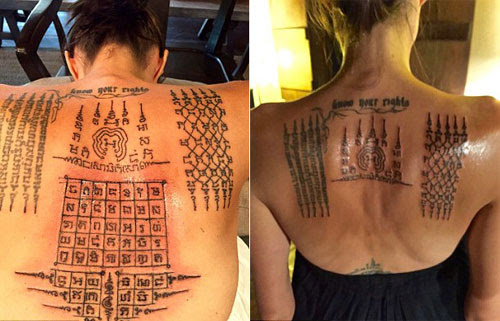 Angelina Jolie nhờ chuyên gia xăm mình Thái Lan thực hiện những dòng chữ cổ, tượng hình trên khắp lưng (trái). Trước đó, cô có nhiều hình xăm thực hiện tại Thái Lan.