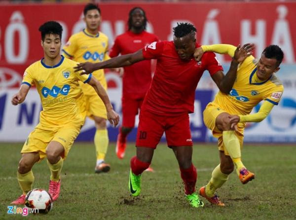 Stevens bật cao đánh đầu đưa bóng về phía cầu môn CLB Thanh Hóa, nhưng cầu thủ đội khách tung người móc bóng giải nguy cho khung thành thủ môn Thanh Thắng ở phút 22.