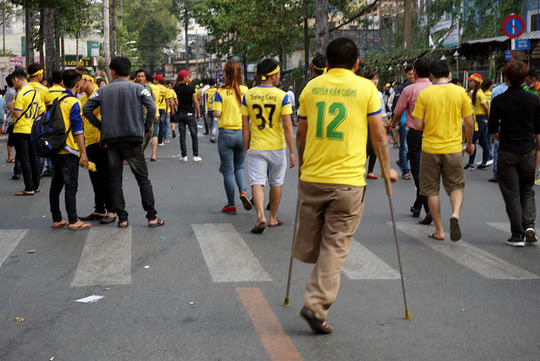 CĐV Nguyễn Văn Cường chống nạn đến sân cổ vũ SLNA.