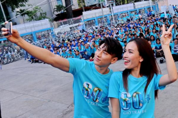 Hai đại sứ của chiến dịch Giờ trái đất năm nay chụp hình cùng 3.000 tình nguyện viên để đăng tải lên trang cá nhân, tạo nên sự lan tỏa trên mạng xã hội - Ảnh: Ngọc Hiển