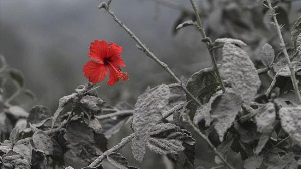 Nhiều người sẽ nghĩ bức ảnh này được can thiệp bằng công nghệ chỉnh sửa màu sắc ảnh, nhưng điều đó hoàn toàn sai. Bức ảnh này được chụp khi một ngọn núi lửa phun trào và bao trùm mọi thứ bằng tro bụi trước khi bông hoa nở.