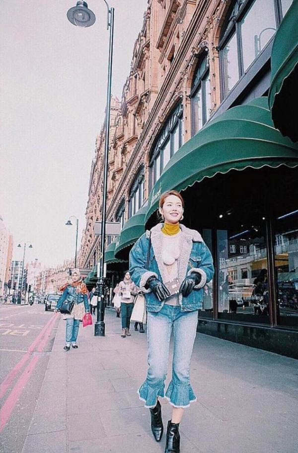 Hình ảnh Minh Hằng trong chuyến du lịch với áo khoác denim lót lông mix kèm quần jeans loe gấu sành điệu