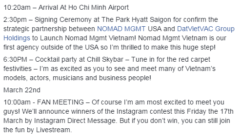 Lịch trình của Coco Rocha sẽ còn kéo dài cho đến 10 giờ ngày 22.3 với Fanmeeting. Coco Rocha không quên bày tỏ sự háo hức khi được gặp gỡ fan Việt và cô đã dùng từ “most excited” để tả về sự kiện này trong lịch trình dày đặc tại Việt Nam của mình.