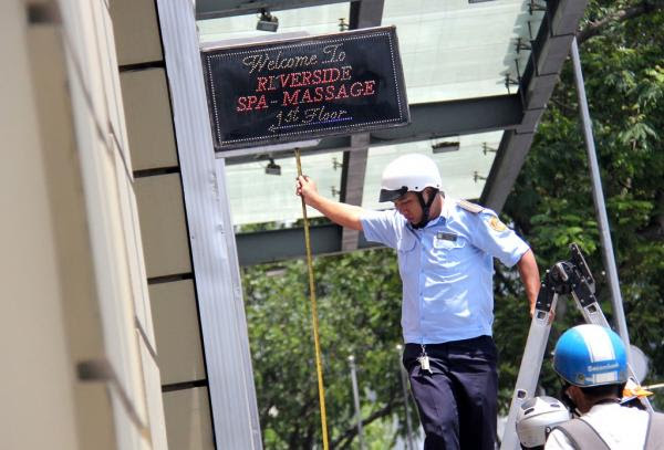 Đoàn liên ngành cũng đo đạc, tháo dỡ bảng hiệu của tiệm spa này .
