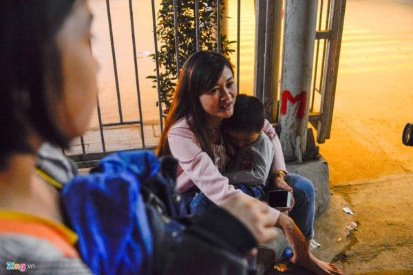 Anh Nguyễn Duy Khanh có mặt ở bến xe Nước Ngầm từ 14h30 để bắt xe về Hà Tĩnh nhưng tới 23h30 hai bố con vẫn phải ngồi ngóng ở sân. Nhiều hành khách khác cũng chung tình cảnh.