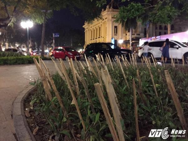 Ngày 10/4, trên một số diễn đàn mạng xã hội xôn xao về hình ảnh vườn hoa Nhà hát lớn Hà Nội, thuộc quận Hoàn Kiếm được cắm chi chít thanh tre, vót nhọn giống như chông.