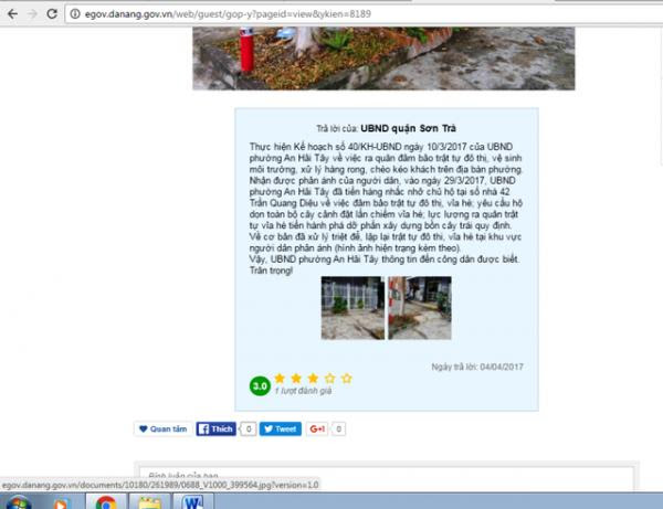 7 ngày sau, UBND quận Sơn Trà có phản hồi, trả lời phản ánh trên. Theo đó, sau khi nhận được phản ánh của người dân, vào ngày 29/3, UBND phường An Hải Tây đã tiến hành nhắc nhở chủ hộ tại số nhà trên về việc đảm bảo trật tự đô thị, vỉa hè; yêu cầu chủ hộ dọn toàn bộ cây cảnh đặt lấn chiếm vỉa hè; đồng thời lực lượng ra quân trật tự vỉa hè đã tiến hành phá dỡ phần xây dựng bồn cây trái quy định.