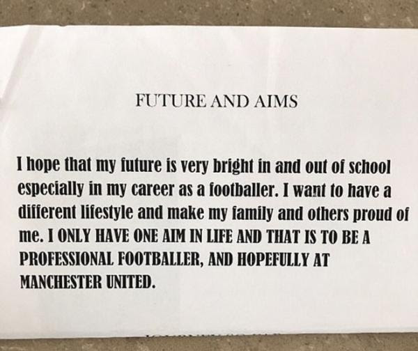 Rashford cũng đăng kèm ảnh chụp mẩu giấy viết về kỳ vọng tương lai ở thời điểm tám năm trước: "Tôi hy vọng có tương lai sáng sủa cả trong và ngoài trường học, đặc biệt là sự nghiệp cầu thủ. Tôi muốn có cách sống khác biệt, đồng thời khiến gia đình và những người khác tự hào về mình. Tôi chỉ có một mục tiêu trong cuộc sống là trở thành cầu thủ chuyên nghiệp và hy vọng được chơi cho Man Utd".