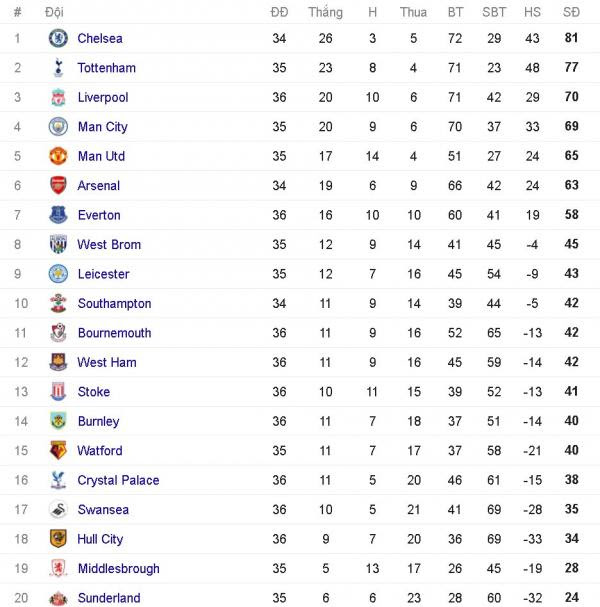 Kết quả vòng 36 Premier League.