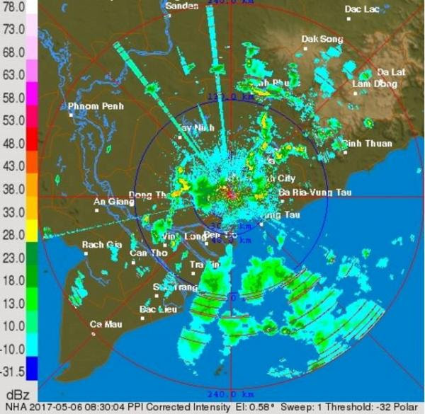 Cụ thể, khoảng 16h30 chiều 6/5, trên số liệu ra đa Nhà Bè, xuất hiện một vùng mây có phản hồi vô tuyến cường độ mạnh. Vùng mây xuất hiện trên khu vực TP.HCM, Bình Phước, Đồng Nai, Long An, Bình Dương, Vĩnh Long, Trà Vinh, Sóc Trăng, Đồng Tháp, An Giang và biển.