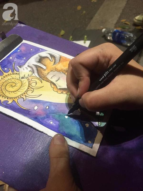 Những tờ A4 được xé làm tư, kẹp trên chiếc bảng nhựa, sau 10 phút biến hóa với sắc màu, cô gái tóc xù đã cho ra đời những bức tranh cực dễ thương mang phong cách cổ tích, như chú lính chì, hoàng tử Bé, giấc mơ của lũ mèo... Mỗi bức tranh có giá 90 nghìn đồng (ảnh: Lynk).