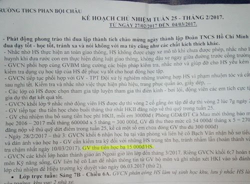 “Ngoài đề cương ôn tập học kỳ I, học kỳ II; các bài kiểm tra định kỳ của tất cả các môn học, nhà trường cũng bắt giáo viên nộp lại văn phòng rồi phô tô thu tiền của các em học sinh với giá mỗi tờ 500 đồng thì chú cứ tính thử, mỗi năm nhà trường thu tiền phô tô của các em là bao nhiêu…”, một giáo viên bức xúc thông tin.